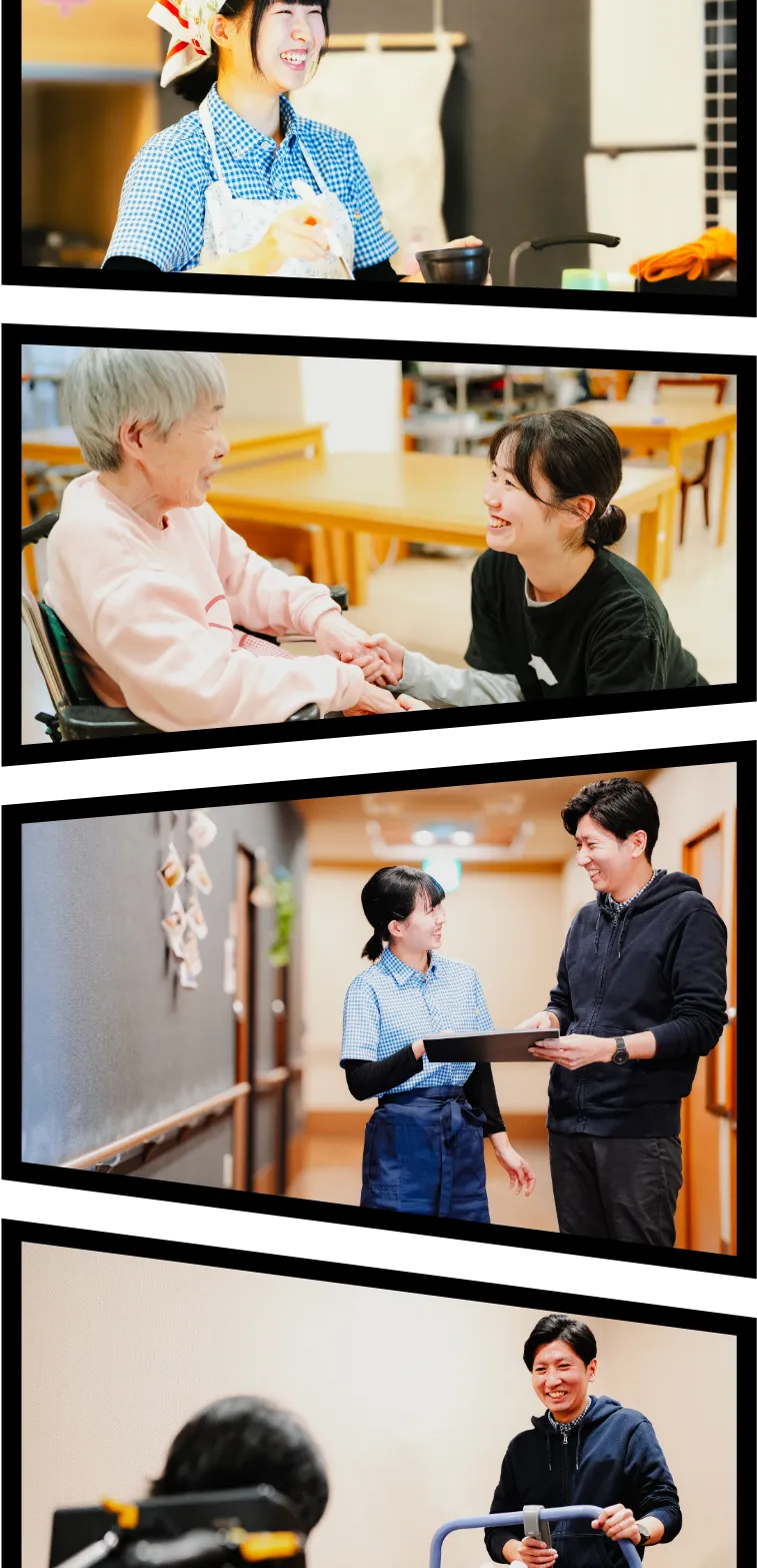 EIJUSOでは、水分・食事・運動・排泄の4つの基本ケアを軸に、ご利用者様の自立支援に取り組んでいます。日常生活動作が少しずつできるようになると、生活が楽になるだけでなく、「自分でできた」という自信や満足感も生まれます。自立支援介護を実現するには、介護職だけでなく看護師やリハビリ職、栄養士など、多職種スタッフの連携が不可欠です。情報を共有し、意見を出し合うことで、一人ひとりに合ったケアプランを作り、効果的な支援が可能になります。未経験でも、こうしたチームの中で学びながら、ご利用者様に寄り添った自立支援の介護スキルを身につけられる環境です。